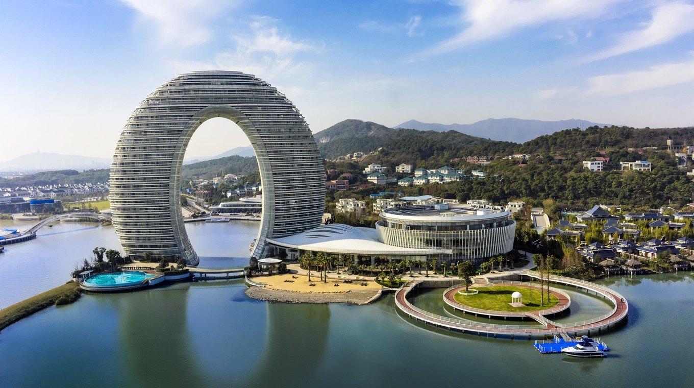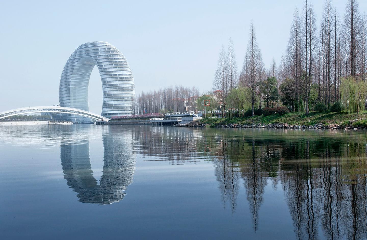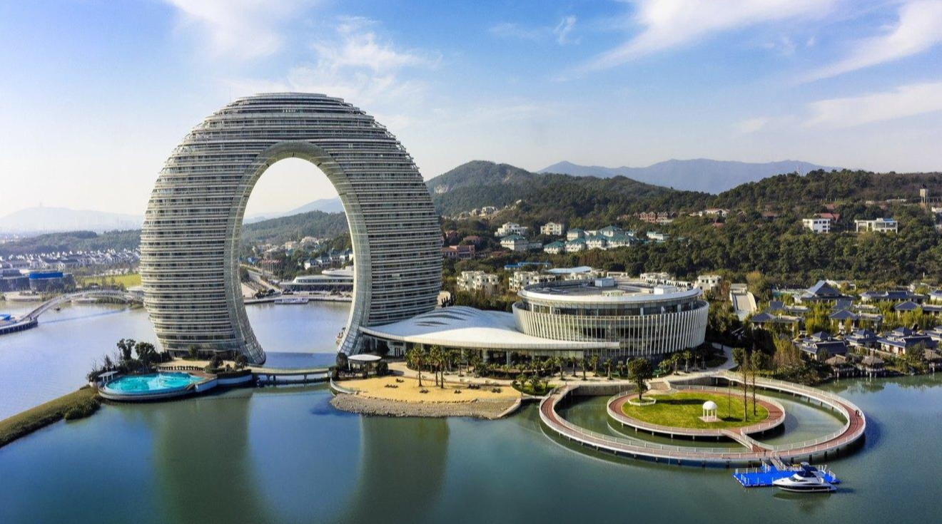 整个酒店从中国古典建筑中汲取灵感,酷似拱桥,建成后的酒店倒影在太湖中,泛起圈圈涟漪,就像是一轮明月倒映在湖水中,让人不得不佩服设计师的巧思。