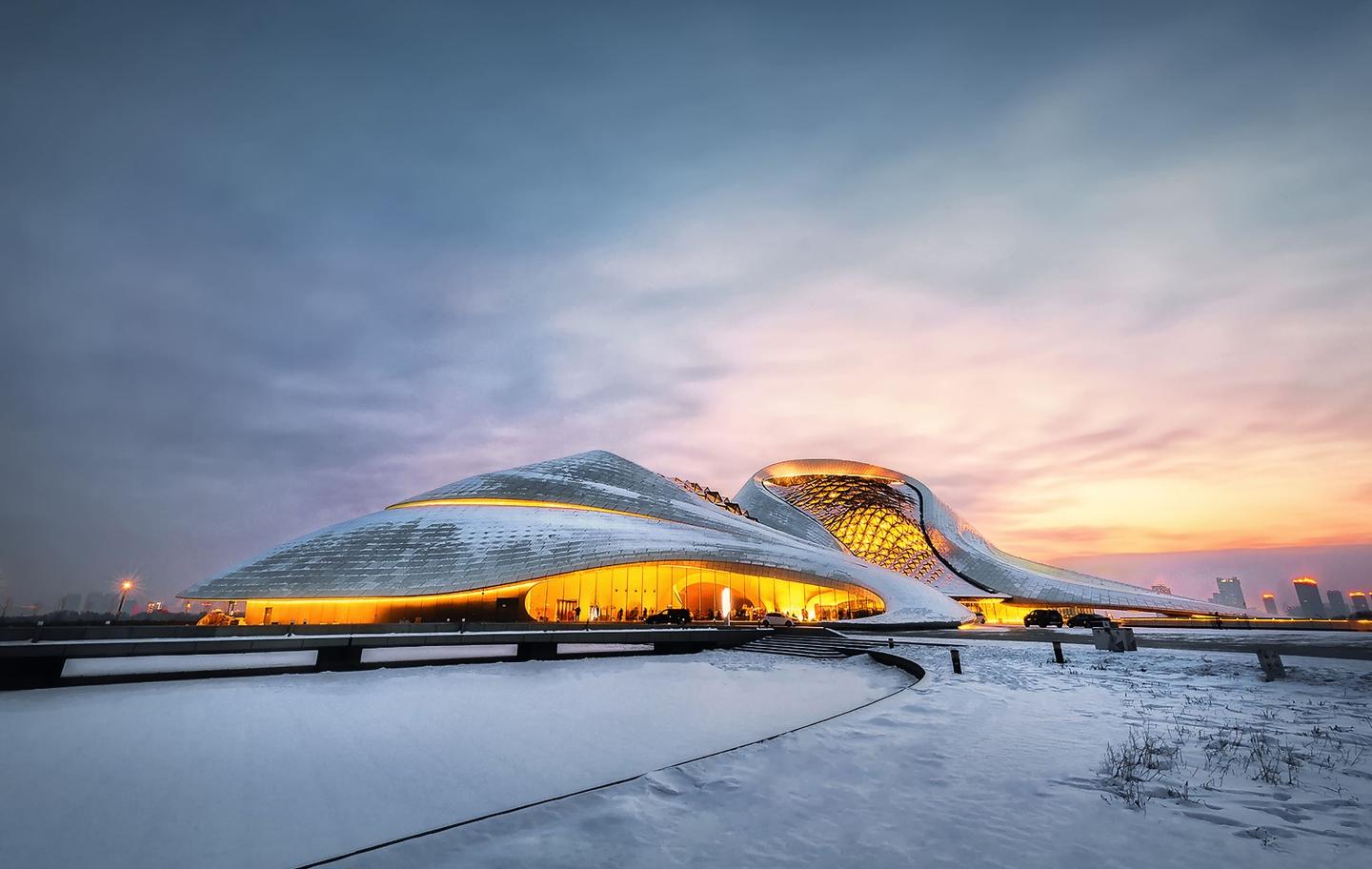 由于剧院坐落在松花江北岸江畔,设计灵感也恰是源自周围的湿地自然风光与北国冰封的地貌特征,建筑外立面采用白色铝质板包裹,张力十足的曲线结构看上去像极了雪峰,与北国风光默契呼应。