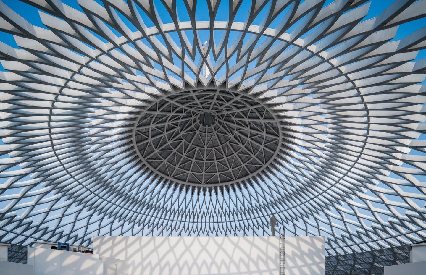 整个大剧院从中东地区阿曼马斯喀特清真寺的穹顶的比例形态及图案纹理中汲取灵感,通过箱型截面钢梁的相互焊接以“编织”出穹顶“纹理”的整体空间结构。